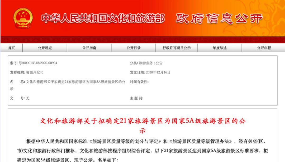 12月16日,国家文旅部公示了21家拟确定为 国家5A级旅游景区 的景区名单。据悉,这21家旅游景区达到了国家5A级旅游景区的标准要求,快来看看有没有你想去的地方↓