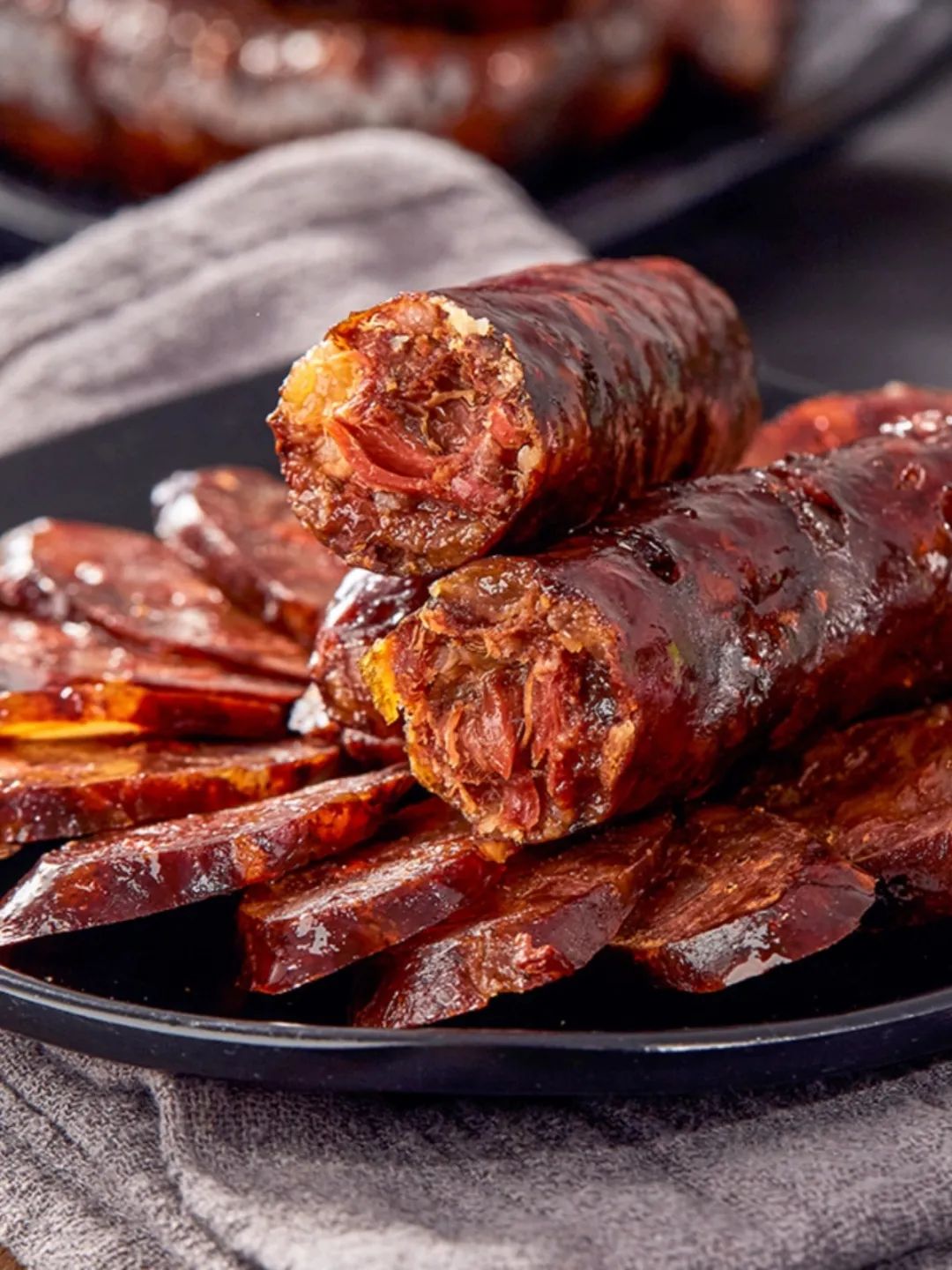 香肠黑褐油亮,滋味醇厚,瘦肉不柴,肥肉不腻,口感醇厚有嚼劲儿,回味长久。