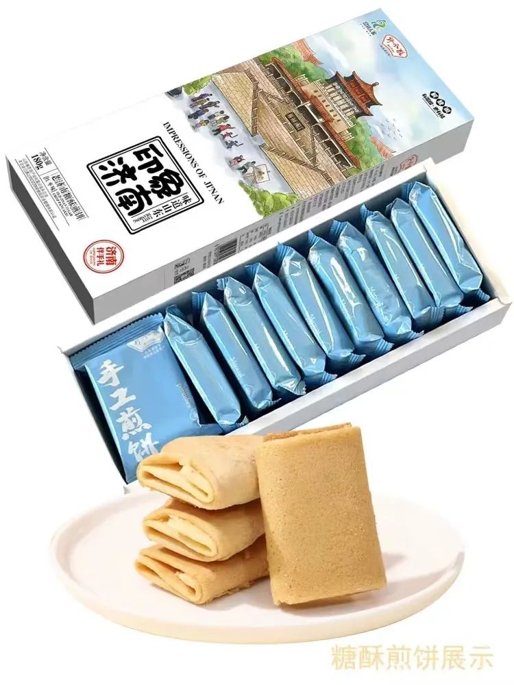 野风酥是山东非遗老字号,手工煎饼,是一种又甜又酥的中式点心,色泽浅黄、薄如蝉翼,轻轻一口咬下去,酥脆的饼皮在口腔中爆开,又瞬间融化于舌尖,带着小米清香的甜味很快充溢开来,回味无穷。