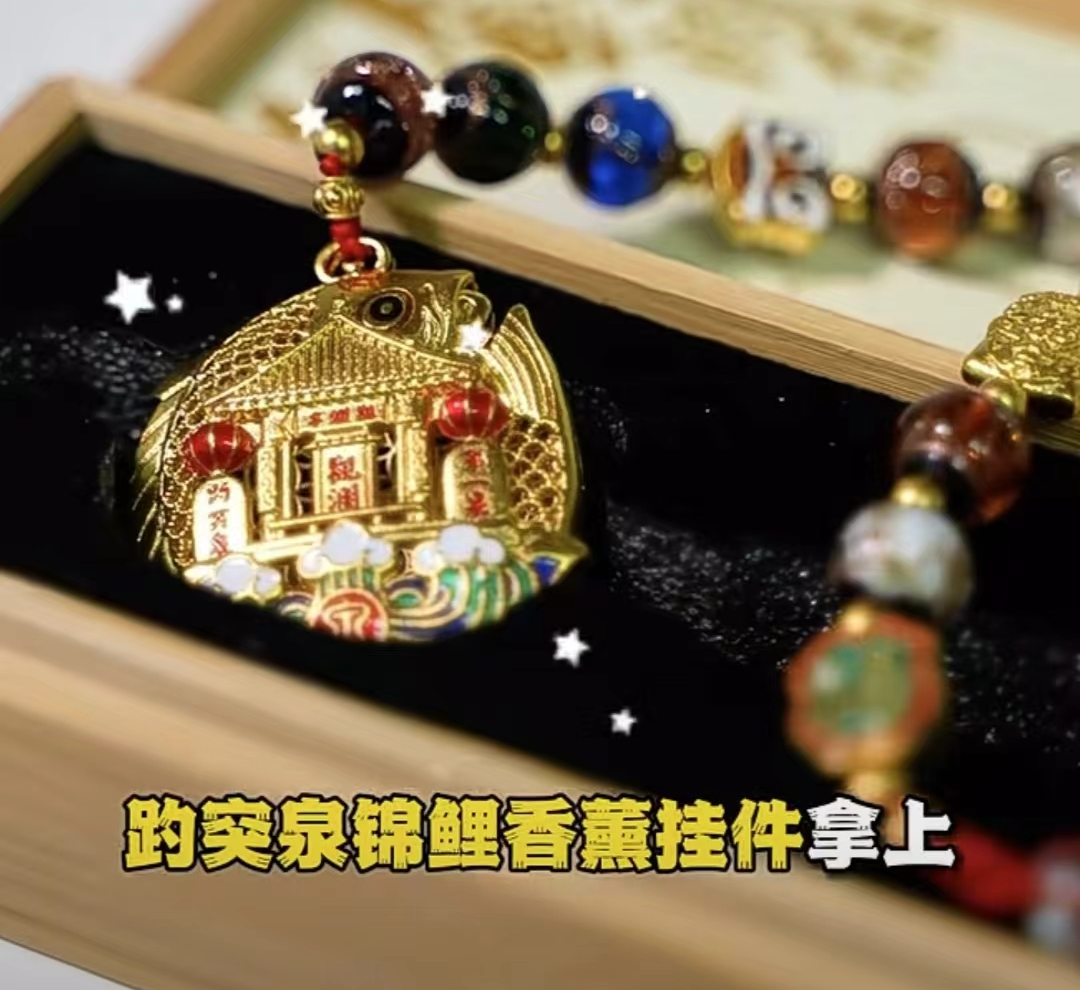 趵突泉的锦鲤频频出圈,这个香薰文创以趵突泉和锦鲤为创意元素,下面是趵突泉三股水,中间是观澜亭,左右两边是可爱锦鲤加身,代表好运连连!