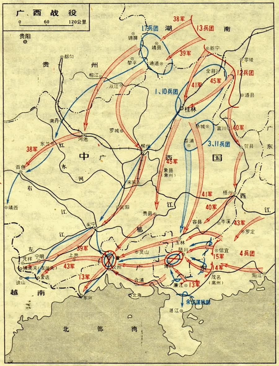 1949年10月,白崇禧以桂林为中心,沿柳州铁路两侧组织防御,阻止解放军入桂。解放军攻占桂林,以秋风扫落叶之势解放广西。