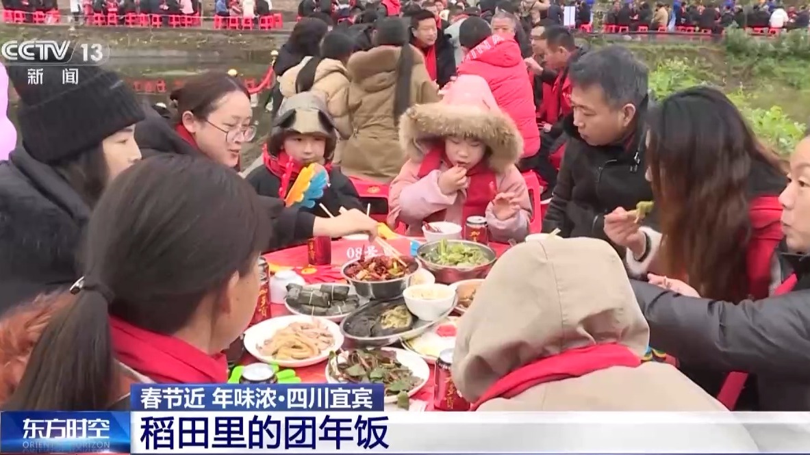随着春节的脚步日益临近,各地的街头巷尾洋溢着愈加浓郁的喜庆氛围。大家忙着贴春联,组织热闹的表演,用各自的方式迎接即将到来的龙年新春。 四川宜宾:稻田里的团年饭 在四川宜宾市南溪区,当地政府组织村民们一起在稻田边办起稻田坝坝宴,庆祝一年来的丰收,喜迎春节。60多桌热气腾腾的团年饭,沿着村里的田坎依次排开。当地传统特色除了鸡、鸭、肘子、烧白等这些的“年味儿”菜肴,当地自产的早虾也端上了餐桌,成了团年饭的主角。
