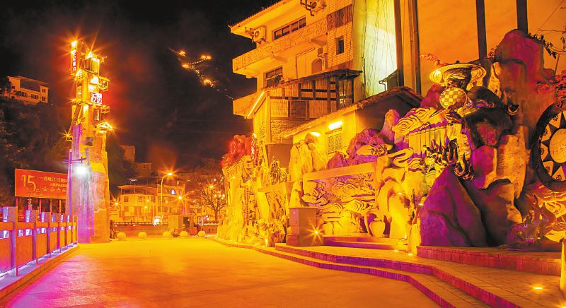 在县城的滨河路,“峨边记忆”一条街以壁雕形式讲述着峨边历史、彝族故事。这条街入选了全国首批“非遗旅游街区”。