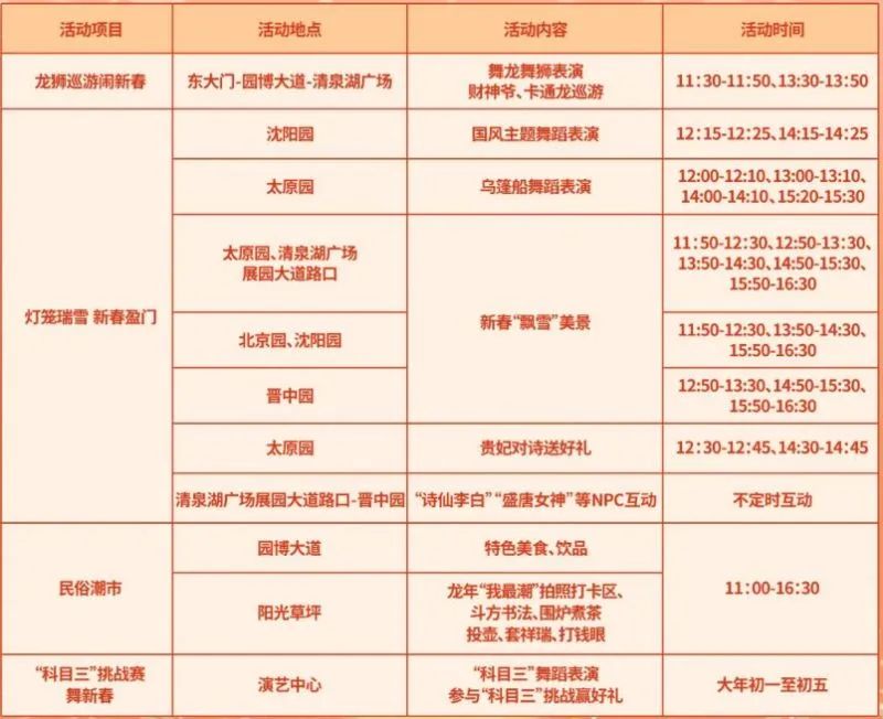 该景区将推出“龙禧新春 欢乐园博”春节系列活动,春节期间,景区20万盆紫罗兰、5000株桃花竞相绽放,还有舞龙舞狮巡游、新春“飘雪”秀、“科目三”挑战赛、趣味民俗游戏等,等着游客来参与。