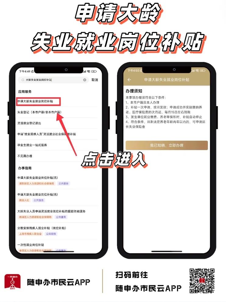 打开“随申办市民云”APP,首页搜索“大龄失业就业岗位补贴”,点击【申请大龄失业就业岗位补贴】或直接扫描下图中二维码,进入页面按提示操作即可申请