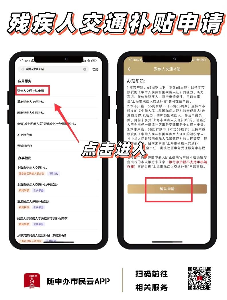 打开“随申办市民云”APP,首页搜索“残疾人交通补贴”,点击【残疾人交通补贴申请】或直接扫描下图中二维码,即可进入申请