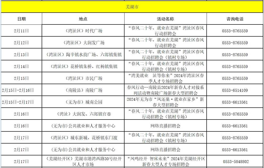 2月15日—16日(正月初六、初七),2024年新春人才对接系列活动(南陵广场新春大型招聘会)将在南陵县南陵广场举行。2月15日-2月17日(正月初六到初八),2024年无为市“凤还巢·就业在家乡”新春大型招聘会将在无为市城南公园举行。2024年市民广场新春专场招聘会2月15日(正月初六)将在芜湖市湾沚区市民广场举行。
