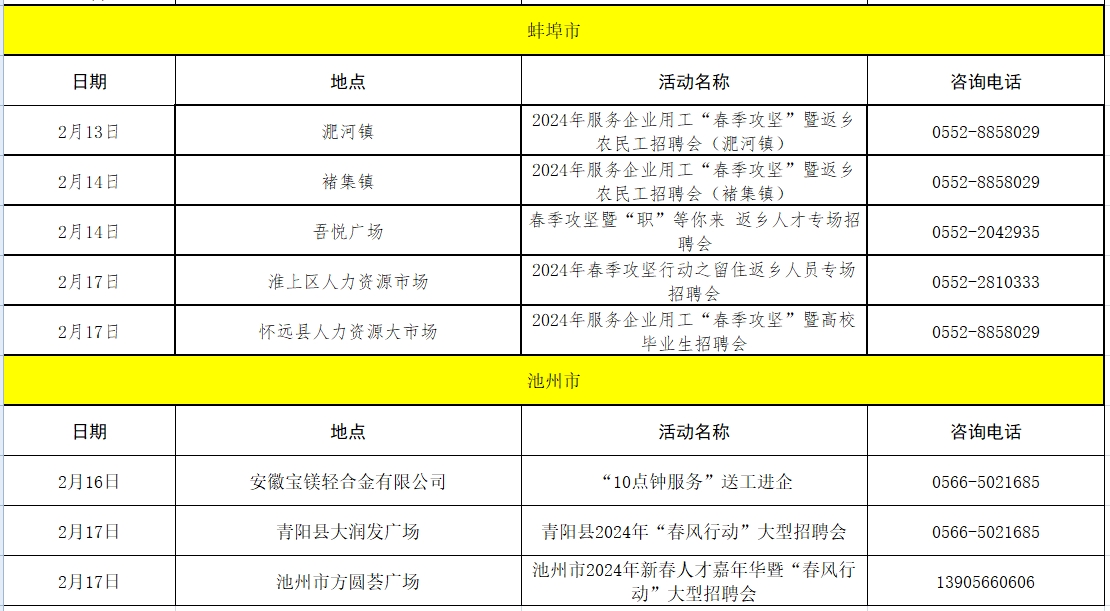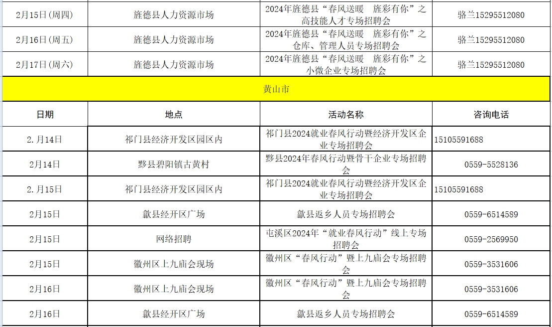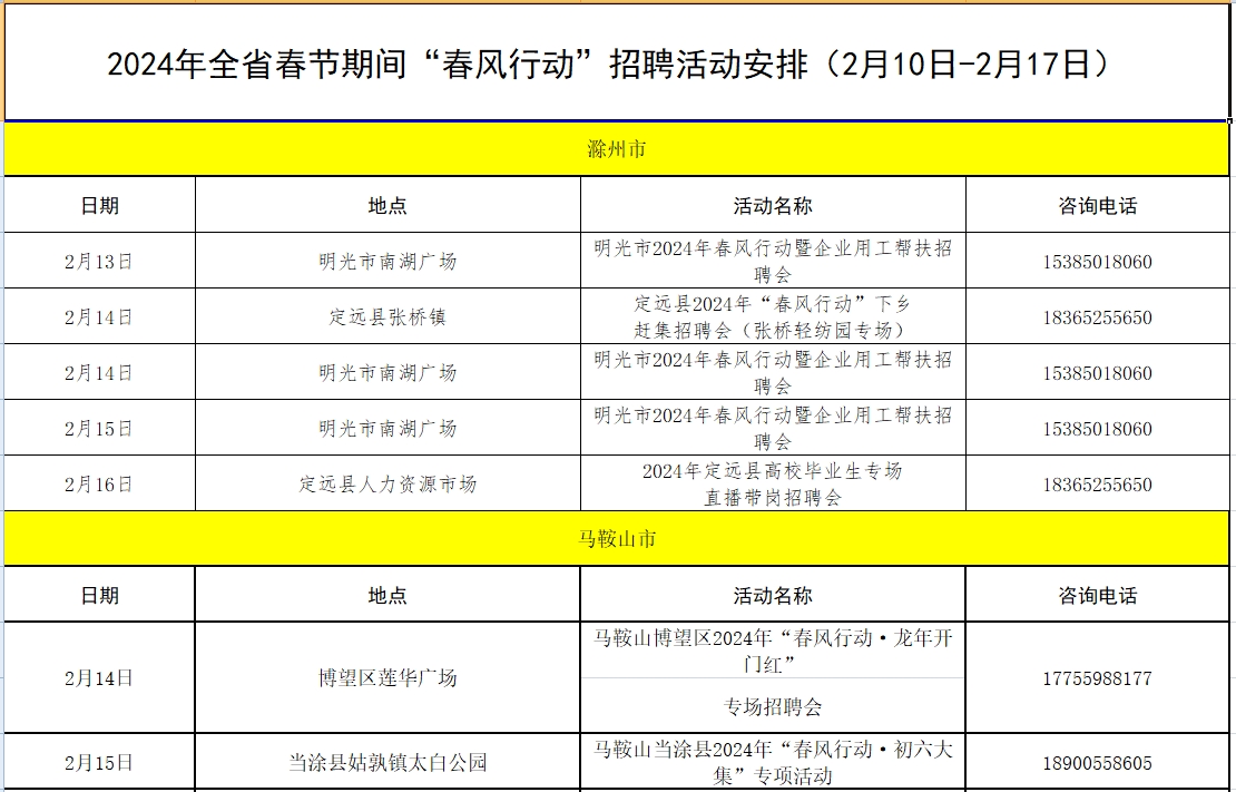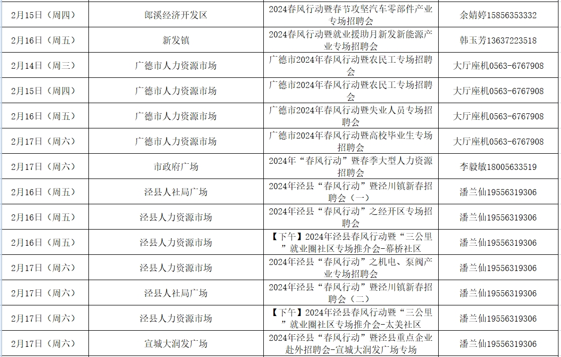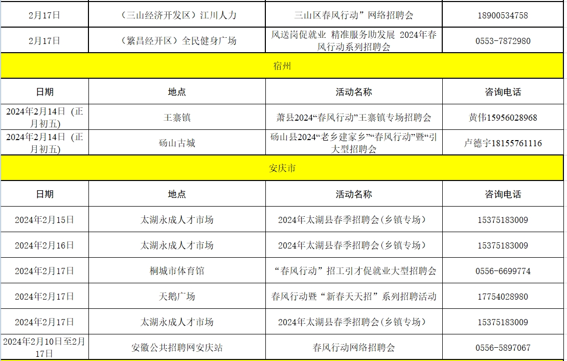 2月15日-16日(正月初六、初七),太湖县组织开展2024年春季招聘会(乡镇专场),地点在太湖永成人才市场。2月17日(正月初八),桐城市组织开展“春风行动”招工引才促就业大型招聘会,地点在桐城市体育馆。2月17日(正月初八),岳西县组织开展春风行动暨“新春天天招”系列招聘活动,地点在岳西县天鹅广场。
