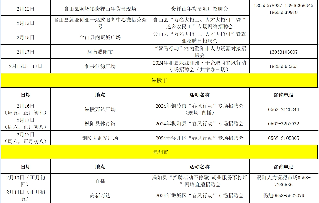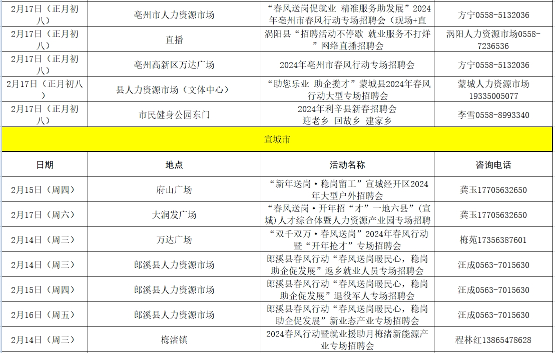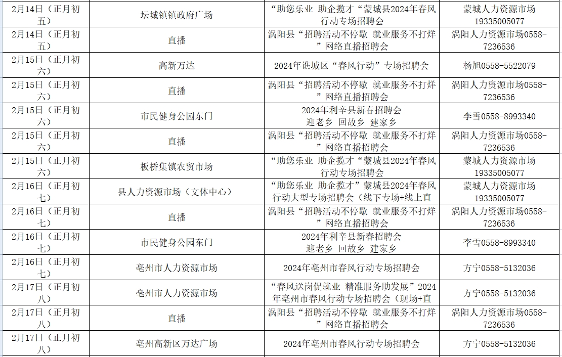 2月17日(正月初八),涡阳县组织开展“招聘活动不停歇 就业服务不打烊”网络直播招聘会。2月17日(正月初八),亳州市人社局组织开展2024年亳州市春风行动专场招聘会,地址在亳州高新区万达广场。