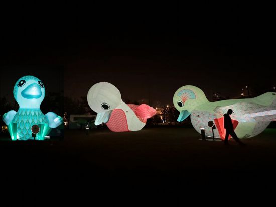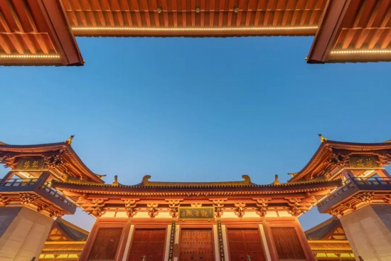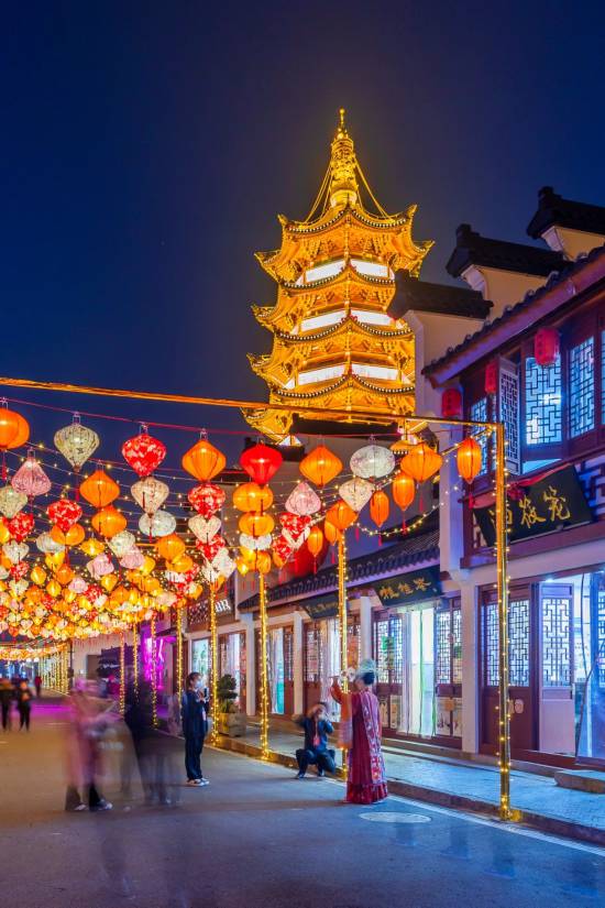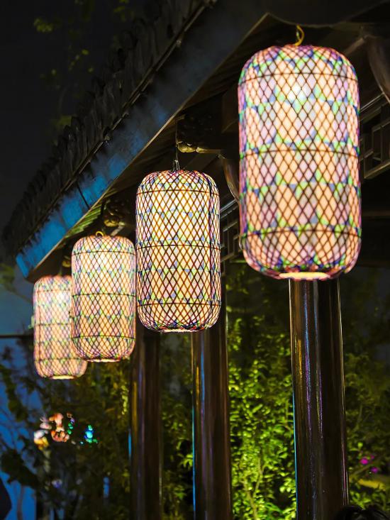 落日之时,街灯亮起,斜晖交映,倒影澄鲜。来自传统灯彩的工艺,注入现代色彩的旖旎,带你感受江南意趣的璀璨冬景。