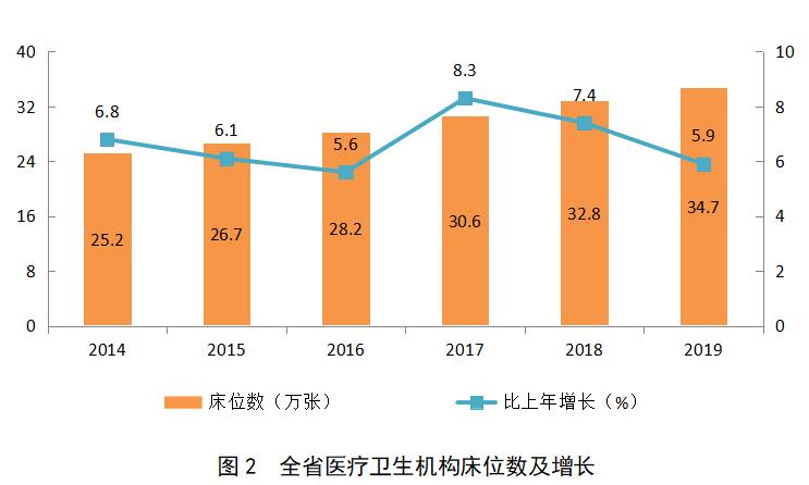 (二)床位数。2019年末,全省医疗卫生机构床位34.7万张,其中:医院27.2万张(占78.3%),基层医疗卫生机构6.9万张(占19.8%)。医院中,公立医院床位占69.7%,民营医院床位占30.3%。与上年比较,全省床位共增加1.9万张(增长5.9%),其中:医院床位增加1.8万张,基层医疗卫生机构床位增加0.17万张。每千人口医疗卫生机构床位数由2018年5.19张增加到2019年5.46张,但仍低于同期全国平均水平。