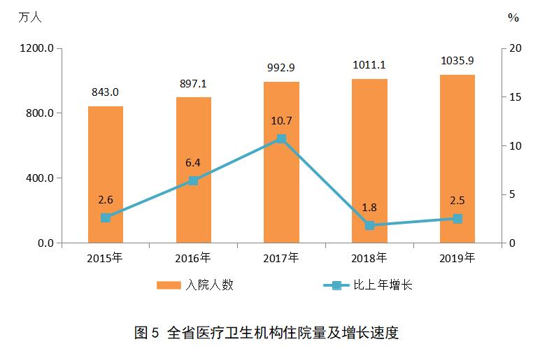 2019年,全省医疗卫生机构入院人数1035.9万人,比上年增加24.8万人(增长2.5%),年住院率为16.25%。