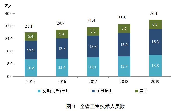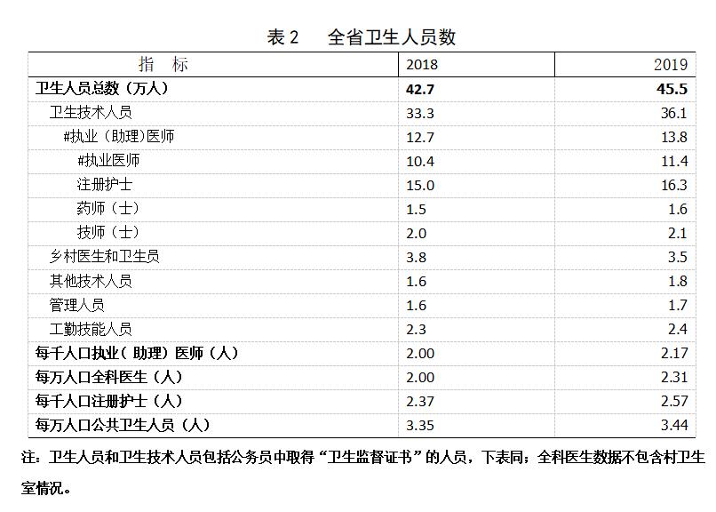 2019年末卫生人员总数中,卫生技术人员36.1万人,乡村医生和卫生员3.5万人,其他技术人员1.8万人,管理人员1.7万人,工勤技能人员2.4万人。卫生技术人员中,执业(助理)医师13.8万人,注册护士16.3万人。与上年比较,卫生技术人员增加2.8万人(增长8.3%) (见表2)。