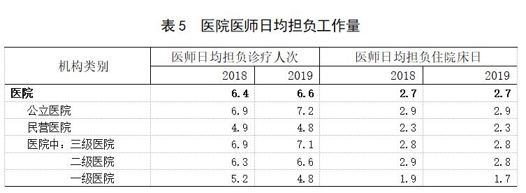 (二)医院医师工作负荷。2019年,全省医院医师日均担负诊疗6.6人次和住院2.7床日,其中:公立医院医师日均担负诊疗7.2人次和住院2.9床日。医院医师日均担负门诊工作量比上年增加;住院工作量与上年基本持平(见表5)。