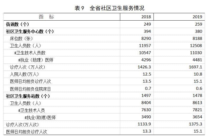 2019年,全省社区卫生服务中心诊疗人次1697.1万人次,入院人数10.8万人;平均每个中心年诊疗量4.5万人次,年入院量284人;医师日均担负诊疗15.1人次和住院0.6床日。2019 年,全省社区卫生服务站诊疗人次1375.3万人次,平均每站年诊疗量9305人次,医师日均担负诊疗15.1人次(见表9)。