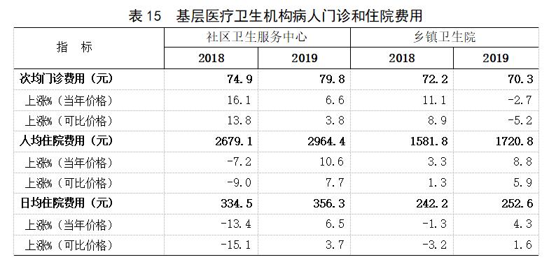 (二)基层医疗卫生机构病人医药费用。2019年,社区卫生服务中心次均门诊费用79.8元,按当年价格比上年上涨6.6%,按可比价格上涨3.8%;人均住院费用2964.4元,按当年价格上涨10.6%,按可比价格上涨7.7%(见表15)。