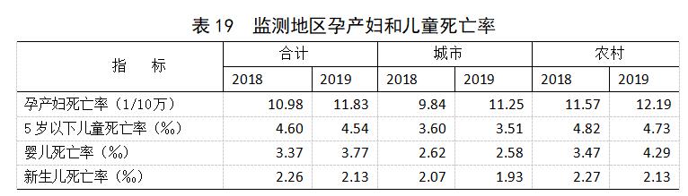 (二)5岁以下儿童死亡率。据妇幼卫生监测,2019年,5岁以下儿童4.54‰,其中:城市3.51‰, 农村4.73‰;婴儿死亡率3.77‰,其中:城市2.58‰, 农村4.29‰。与上年相比,5岁以下儿童死亡率略有下降、婴儿死亡率上升(见表19)。