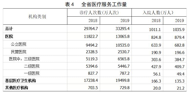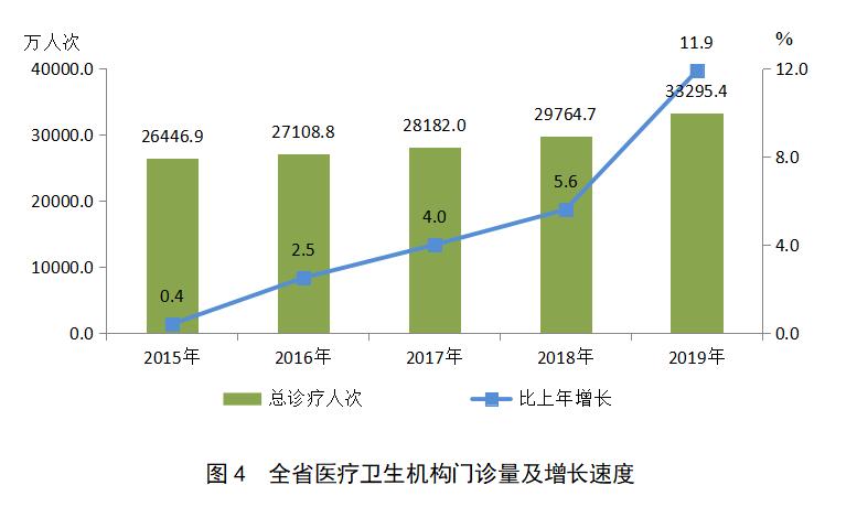 (一)门诊和住院量。2019年,全省医疗卫生机构总诊疗人次(含村卫生室)达33295.4万人次,比上年增加3530.7万人次(增长11.9%)。2019年全省居民到医疗卫生机构平均就诊5.2次。