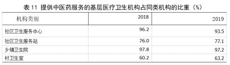 2019年末,提供中医服务的社区卫生服务中心占同类机构的93.5%,社区卫生服务站占77.1%,乡镇卫生院占97.2%,村卫生室占63.2%(见表11)。