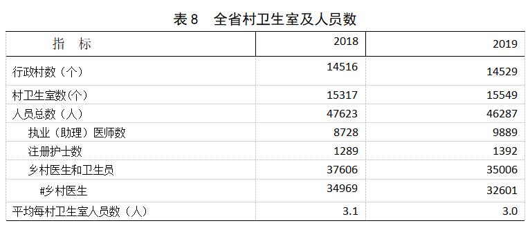2019年底,全省共14529个行政村共设15549个村卫生室。村卫生室人员达46287人,其中:执业(助理)医师9889人、注册护士1392人、乡村医生和卫生员35006人。平均每村卫生室人员3.0人。与上年比较,村卫生室增加232个,人员总数减少1336人 (见表8) 。