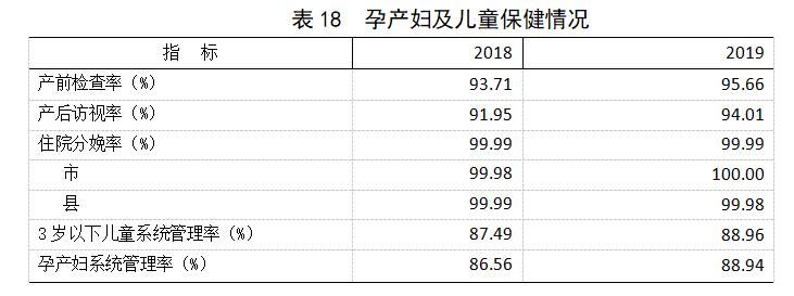(一)妇幼保健。2019年,孕产妇产前检查率95.66%,产后访视率94.01 %。2019年住院分娩率为99.99%(市100.00%,县99.98%),与上年持平。