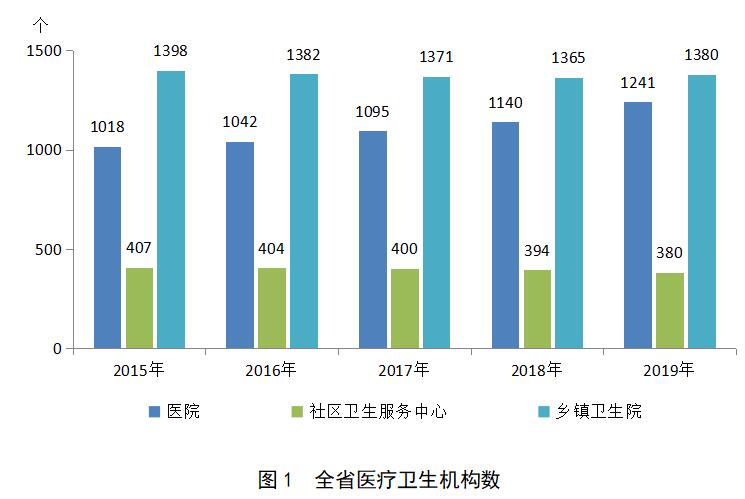 (一)医疗卫生机构总数。2019年末,全省医疗卫生机构数达26436个,比上年增加1510个。其中:医院1241个,基层医疗卫生机构24558个,专业公共卫生机构545个。与上年相比,医院增加101个 ,基层医疗卫生机构增加1482个(见表1)。