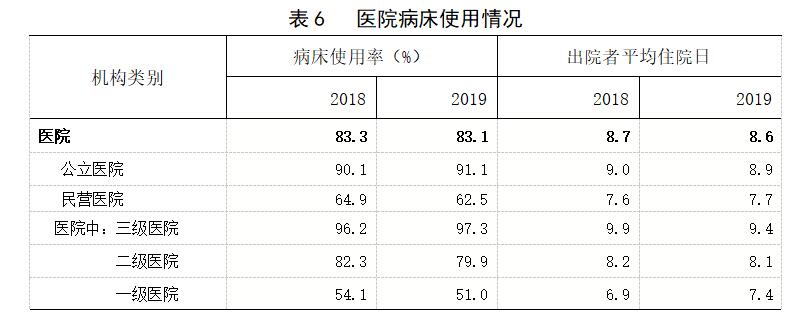 (三)病床使用。2019年,全省医院病床使用率83.1%,其中:公立医院91.1%。与上年比较,医院病床使用率下降0.2个百分点(其中:公立医院上升1.0个百分点)。2019年医院出院者平均住院日为8.6日(其中:公立医院8.9日),医院出院者平均住院日比上年略有下降(见表6)。
