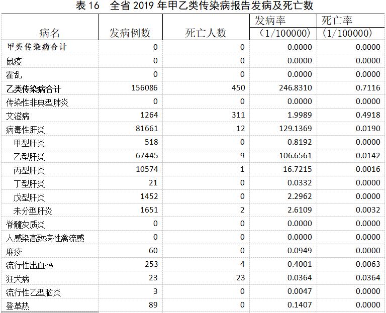 疫情按类别统计:无甲类传染病报告。乙类传染病除新生儿破伤风、炭疽、人感染致病性禽流感、人感染H7N9禽流感、脊髓灰质炎、传染性非典型费用、白喉7种无发病、死亡报告外,其他19种共报告发病156086例,死亡450人;报告发病率为246.8310/10万,较2018年上升8.29%;报告死亡率为0.7116/10万,较2018年上升8.56%。报告发病数居前5位的病种依次为病毒性肝炎、肺结核、梅毒、细菌性和阿米巴性痢疾、淋病,占乙类传染病报告发病总数的97.06%;报告死亡数居前3位的病种依次为艾滋病、肺结核、狂犬病,占乙类传染病报告死亡总数的95.56%(见表16)。
