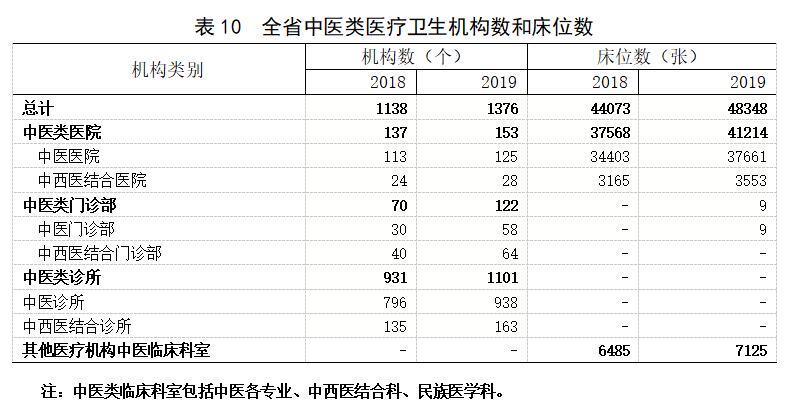 (一)中医类机构、床位及人员数。2019年末,全省中医类医疗卫生机构总数达1376个,比上年增加238个。其中:中医类医院153个,中医类门诊部、诊所1223个。与上年比较,中医类医院增加16个,中医类门诊部及诊所增加222个(见表10)。