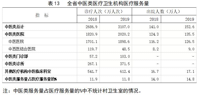 (二)中医医疗服务。2019年,全省中医类诊疗人次达3107.0万人次,比上年增加420.1万人次(增长15.6%)。其中:中医类医院2020.2万人次(占65.0%),中医类门诊部及诊所474.5万人次(占15.3%),其他医疗机构中医类临床科室612.4万人次(占19.7%)。