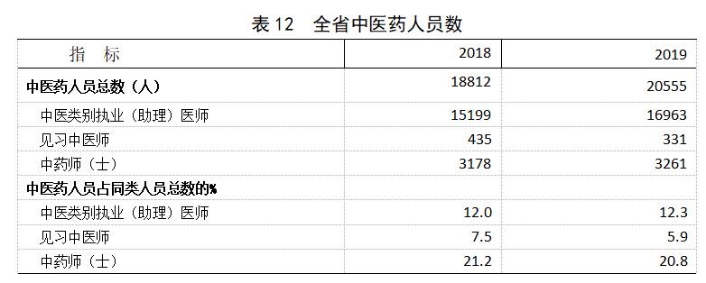 2019年末,全省中医药人员总数达20555人,比上年增加1743人(增长9.27%)。其中:中医类别执业(助理)医师16963人,中药师(士)3261人。两类人员较上年有所增加(见表12)。