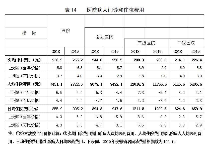 (一)医院病人医药费用。2019年医院门诊病人次均医药费用255.2元,按当年价格上涨6.8%,按可比价格上涨4.0%;医院人均住院费用7822.5元,按当年价格上涨5.0%,按可比价格上涨2.2%。日均住院费用905.2元,按当年价格上涨5.8%,按可比价格上涨3.0%(见表14)。
