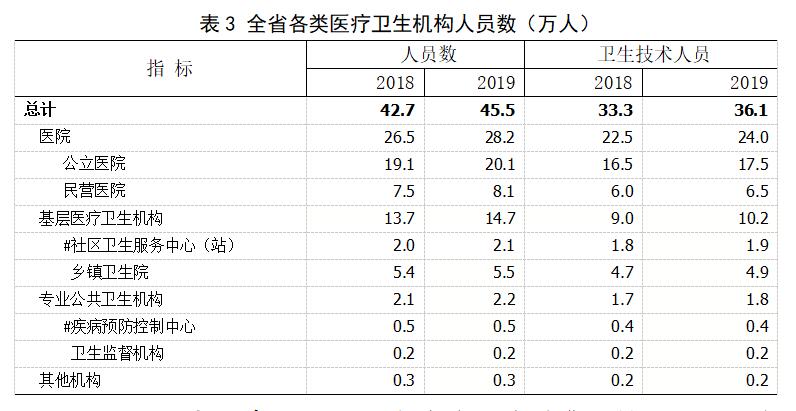 2019年末卫生人员机构分布:医院28.2万人(占62.1%),基层医疗卫生机构14.7万人(占32.4%),专业公共卫生机构2.2万人(占4.8%)(见表3)。