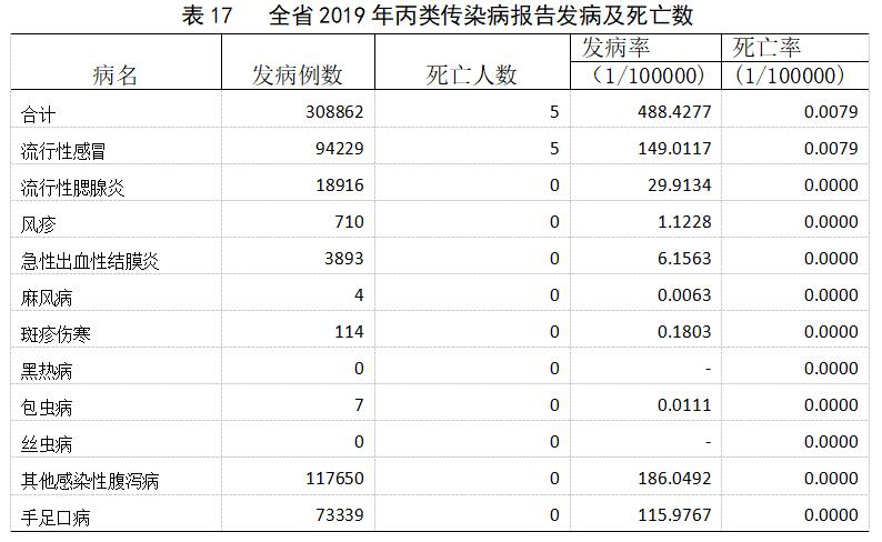 (一)传染病报告发病和死亡。2019年,全省共报告法定报告传染病发病464948例,死亡455人,报告发病率为735.2587/10万,报告死亡率为0.7195/10万。