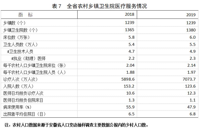 2019年,全省乡镇卫生院诊疗人次达7073.7万人次,比上年增加1175.1万人次;入院人数123 .6万人,比上年减少29.6万人。2019年,乡镇卫生院医师日均担负诊疗12.3人次和住院1.1床日。病床使用率47.9%,出院者平均住院日6.8日。与上年相比,乡镇卫生院医师门诊工作负荷上升,住院负荷下降,病床使用率下降。