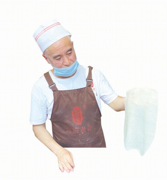 尚红发拿起刚刚擀好的面皮向人们展示。