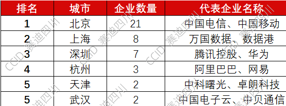 在城市分布方面,北京占有明显领先地位,上海、深圳位列第二梯队,一线城市凭借其研发创新、人才集聚等优势,占据榜单领先位置和大部分席位。在榜单中,北京以中国电信、中国移动等电信运营商以及百度、京东等互联网企业为代表,上海则主要以万国数据、数据港等数据中心企业为代表。
