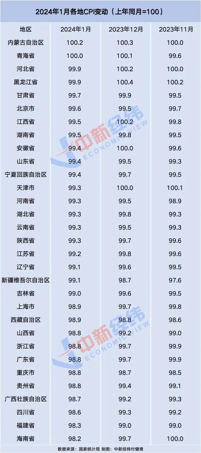 日前,国家统计局公布了31省份2024年1月居民消费价格指数(CPI),2024年1月,全国CPI环比上涨0.3%,同比下降0.8%,同比连续第四个月处于负值区间。中新经纬梳理发现,31省份1月CPI同比“跌多涨少”。其中,仅内蒙古同比上涨,29省份下降,1省份持平。