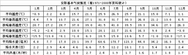安阳位于河南最北部,属暖温带大陆性季风气候,四季分明,日照充足,雨量集中。春季干旱多风沙,夏季炎热多雨,秋季温和晴明,冬季寒冷干燥,全年降雨量为600毫米左右,多集中在6~8月。年平均气温14℃,最冷月1月份的多年平均气温-1℃左右,最热月7月份的多年平均气温27℃左右,年日照2500小时。冬季北风偏多,而夏季则以南风为主。最佳旅游时间为秋季。