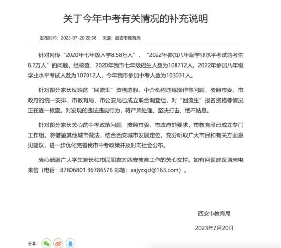 此前,7月18日,西安市教育局官网发布关于今年中考有关情况的说明。说明内容如下: