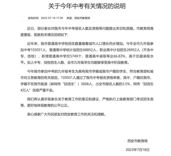 原标题:《针对“回流生”有关问题,西安市教育局回应》