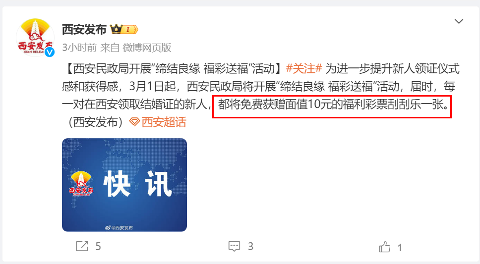 据西安发布官方微博2月27日消息, 为进一步提升新人领证仪式感和获得感,3月1日起,西安民政局将开展“缔结良缘 福彩送福”活动,届时,每一对在西安领取结婚证的新人,都将免费获赠面值10元的福利彩票刮刮乐一张。