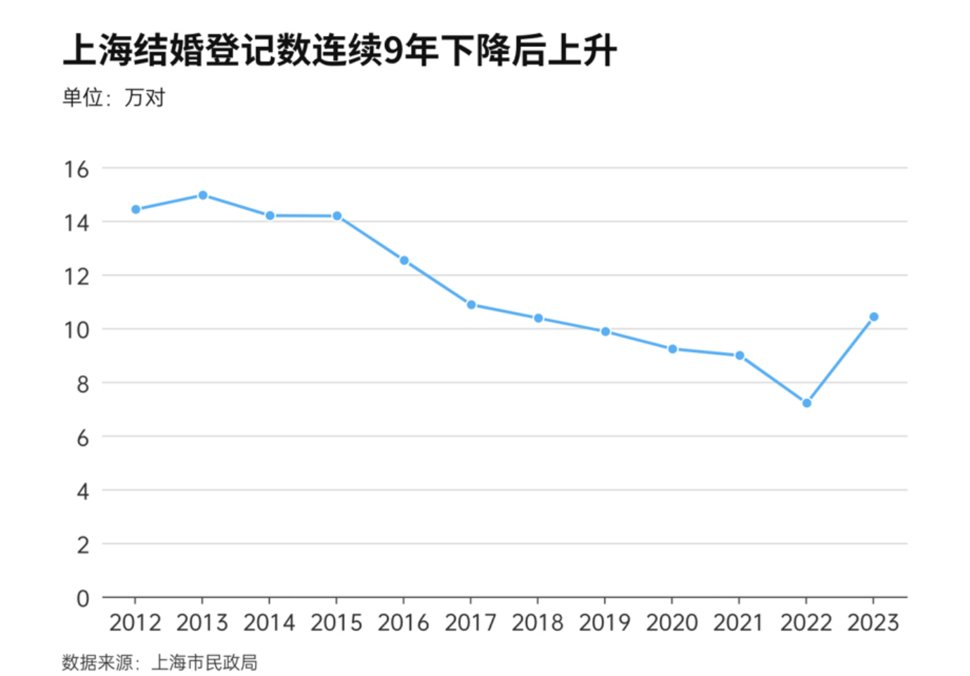 据上观新闻,2023年,上海有10.42万对新人登记结婚,这个数字相比2022年上涨了44.6%,而且还是近十年来唯一一次结婚人数相比上一年上涨!