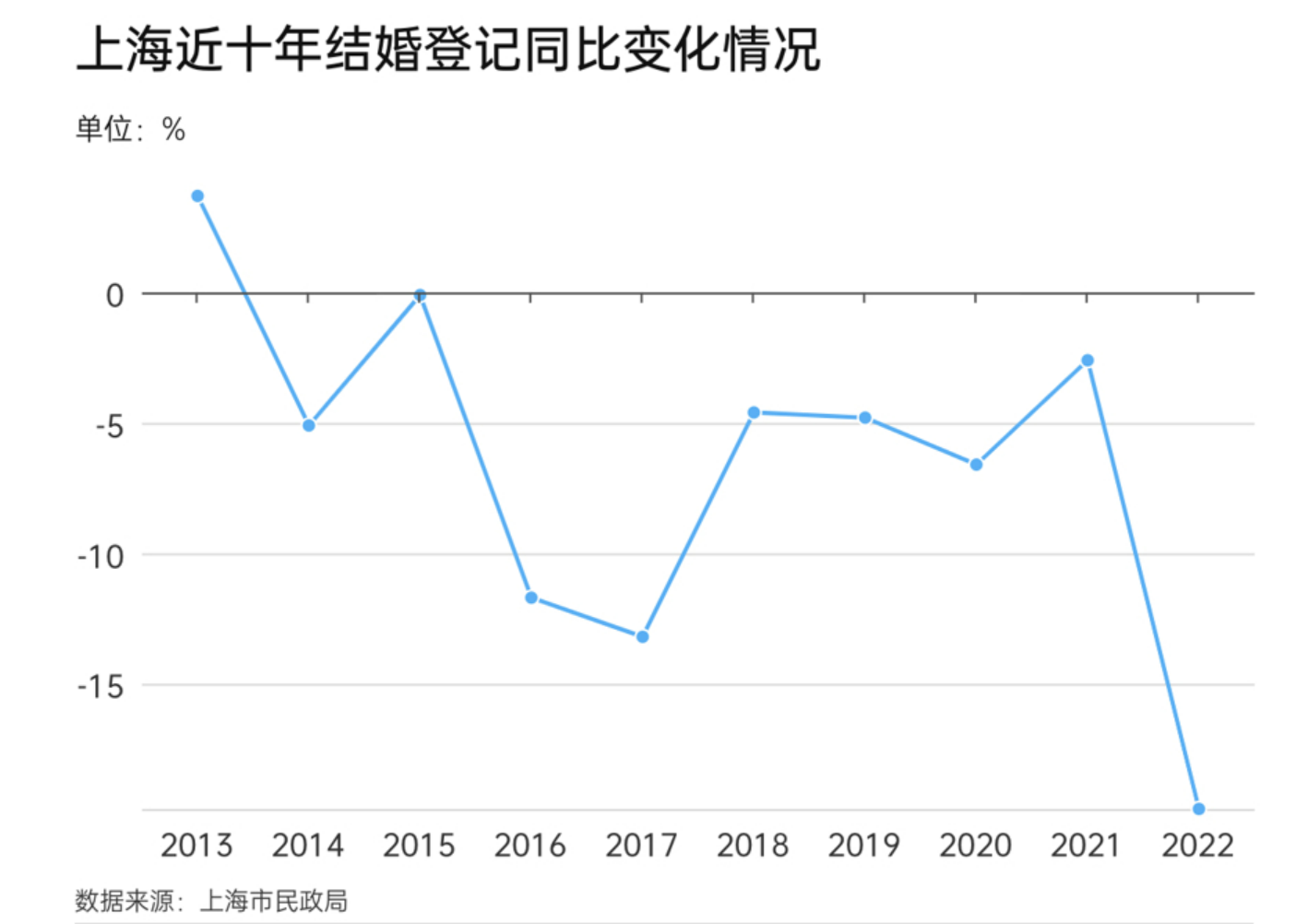 数据可以佐证。2022年,上海结婚领证的新人共有7.2万对,是自1990年以来的最低值。虽说近20年来,结婚人数处于波动下降的趋势,但2022年的降幅不寻常,远超近十年平均水平(约为5%),相比2021年下降了约20%。