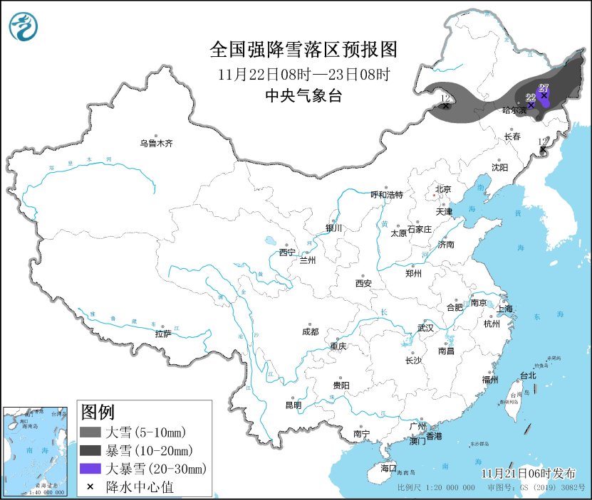 预计,11月21日08时至11月23日08时,内蒙古东部、黑龙江中东部、吉林长白山区等地的部分地区有大到暴雪,局地大暴雪,累积降雪量将有8~20毫米,局地可达20~30毫米,新增积雪深度6~15厘米,局地可达20厘米左右;吉林中部、黑龙江东南部等局地有冻雨;雨雪天气主要影响时段为21日夜间至22日。中央气象台11月21日06时发布暴雪黄色预警(图4、图5)。
