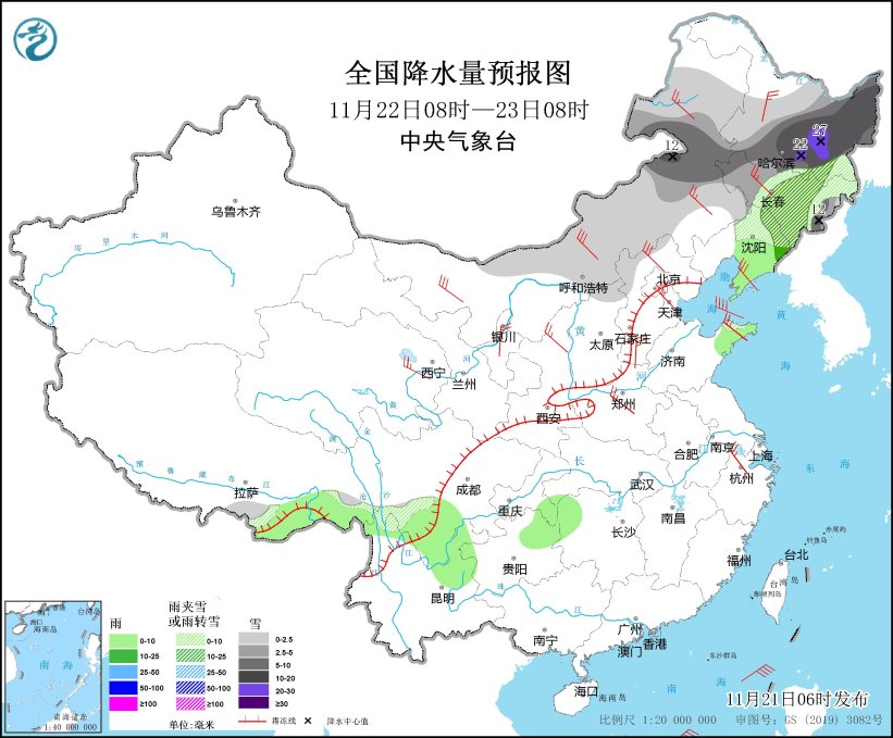 11月22日08时至23日08时,内蒙古东部、黑龙江中东部、吉林长白山区等地部分地区有大到暴雪,黑龙江中部偏南地区局地有大暴雪(20~27毫米),上述部分地区新增积雪深度6~15厘米,局地20厘米左右。