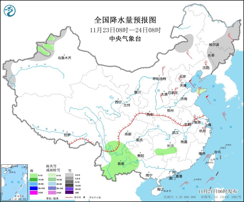 图8 全国降水量预报图(11月23日08时-24日08时)