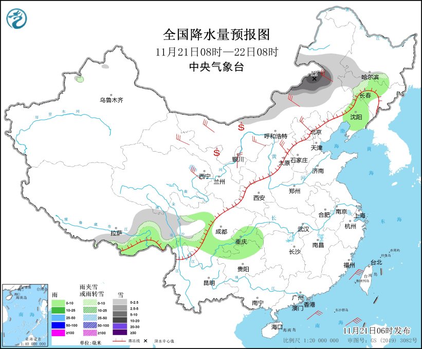 11月21日08时至22日08时,内蒙古东部、黑龙江西南部、吉林西部等地部分地区有小到中雪或雨夹雪,其中,内蒙古东部局地有大到暴雪(10~12毫米)。吉林中部、辽宁大部、西藏东南部、四川盆地南部、重庆大部、贵州北部、云南东北部等地部分地区有小雨。西北地区中部和东北部、内蒙古大部、华北西部和北部等地部分地区有4~6级风。内蒙古河套地区、甘肃河西等地局地有扬沙(见图6)。