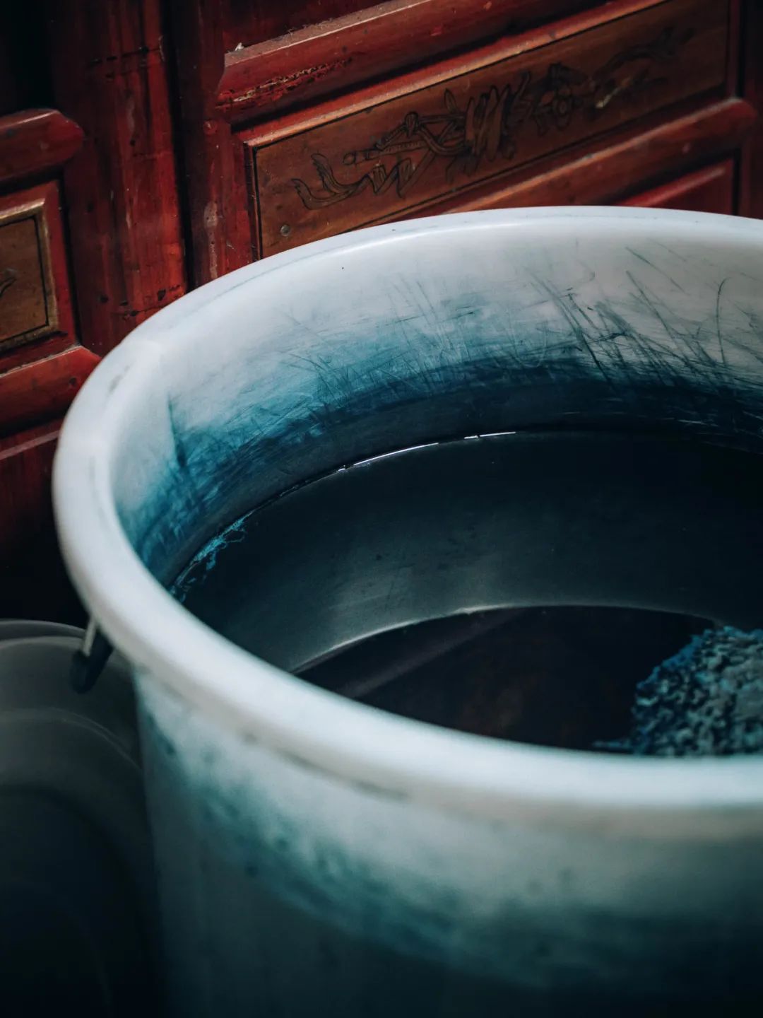 二楼的温度也比较适宜,平时会开启空调,所以我把染缸都放在二楼,蓝夹缬的染缸里驯养着一群微生物,已经三四年之久。这个颜色也不是蓝色,是绿色的。染出来的布刚拿出来是由绿色慢慢转变成蓝色。缸口浮着的泡沫,有着抗菌消炎的作用,如果手皮被刮破了,拿过来抹一下便可,连创可贴都不需要。