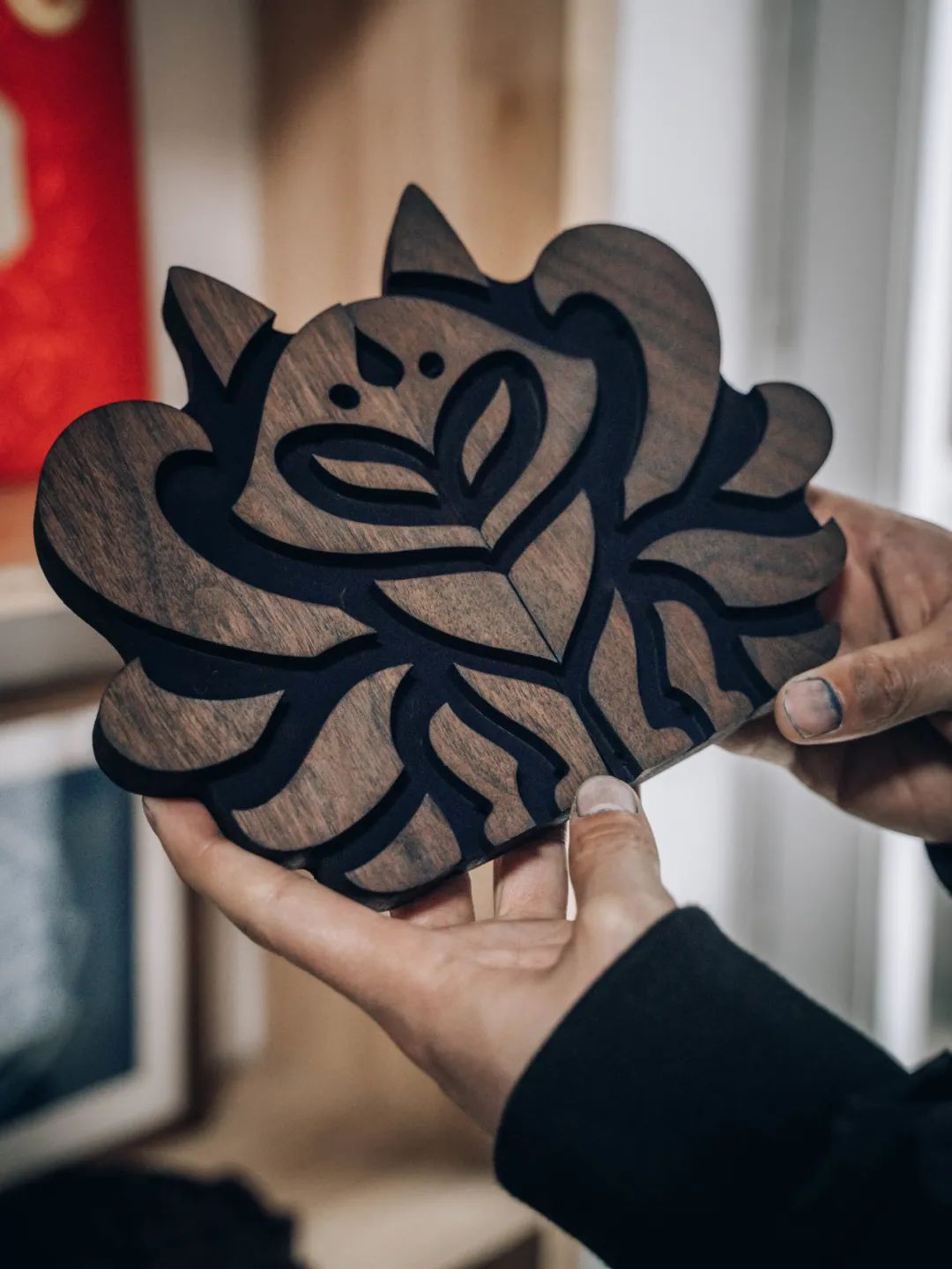 工作室内的托盘、雕版都是我自己设计的。数控编程、数控加工我都会做,后来我将这些交给一位朋友帮忙制作,我负责设计,无缝衔接,有些也会放在网上出售。